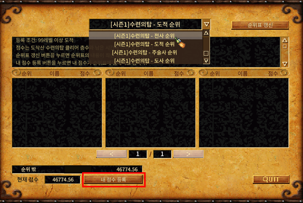 ⑤ 시즌 도전 기간 내 순위 페이지에서 수련의탑 순위 점수를 등록합니다.